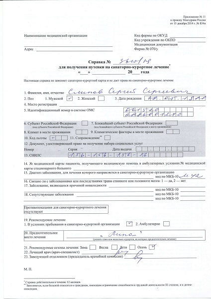 Справка 070 у 04 имеет стандартный образец заполнения. Данный документ является официальным для получения льгот, однако наличие этого документа никак не гарантирует, что получится бесплатно отдохнуть в санатории. Также справка для получения путевки не сможет стать решающим фактором в предоставлении места в санатории, если все комнаты уже заняты.