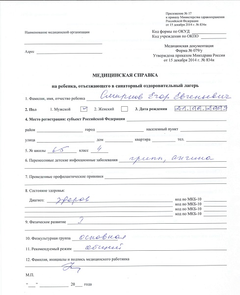 Справка для лагеря