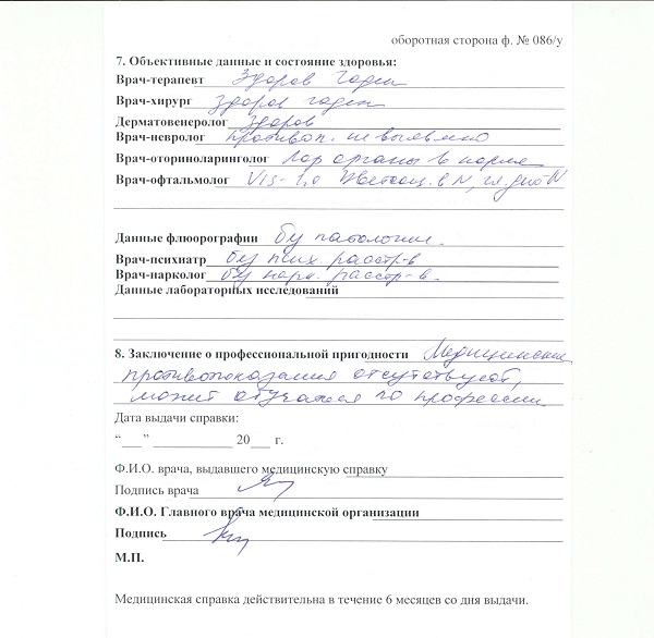 Если вы хотите получить справки 086 для поступления полностью бесплатно, то следует обращаться в государственную поликлинику по адресу проживания, куда вы уже обращались и где будет ваша амбулаторная карточка. Здесь придется пройти всех специалистов самостоятельно: